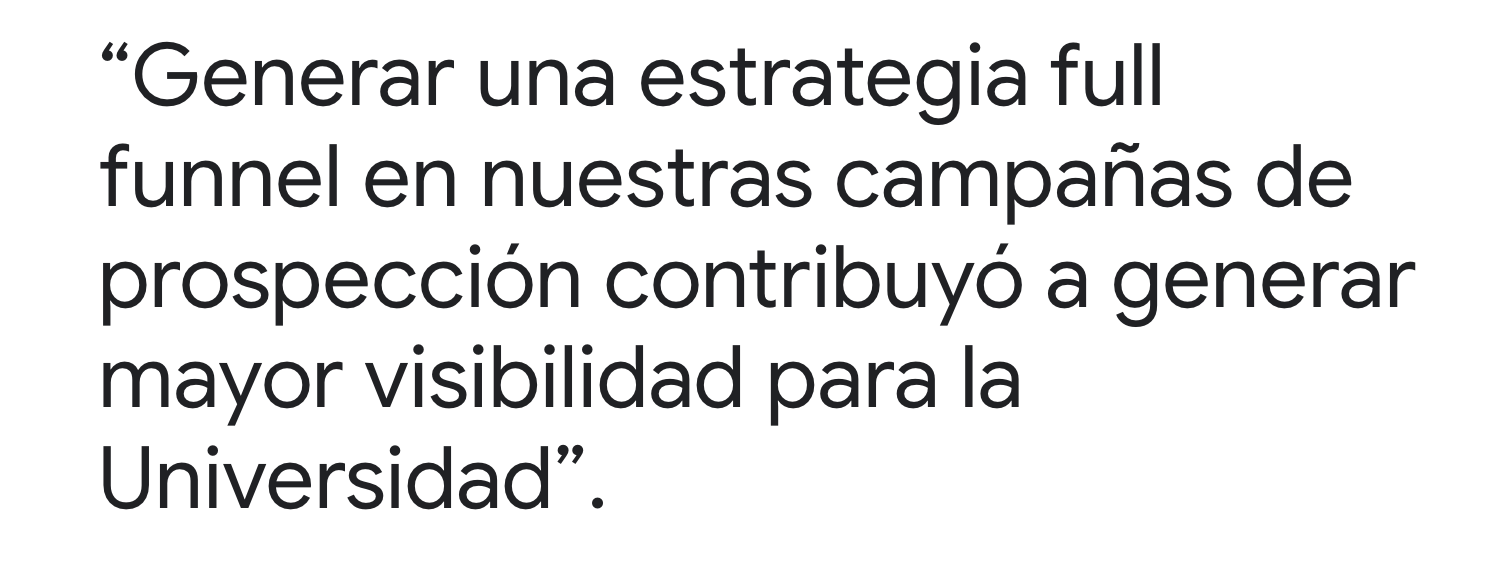 ¿El resultado? Además de incrementar las solicitudes un 10% interanual, centrarse en la generación de demanda le permitió conseguir un 25% de clientes potenciales incrementales y una tasa de conversión 109% más alta con un costo por adquisición 19% menor. En otras palabras, la universidad logró captar a aquellos estudiantes que ya estaban interesados ​​en la institución y, además, convertirse en una opción para nuevos estudiantes al trabajar en el conocimiento de su marca.