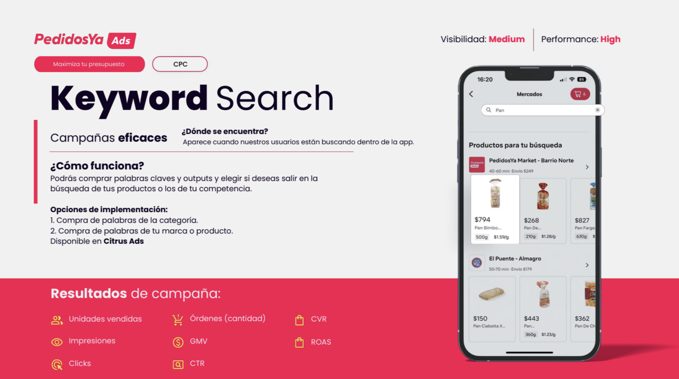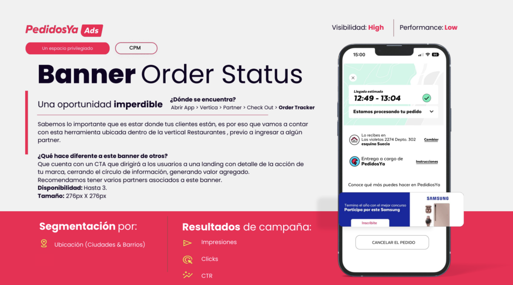 Dentro de los formatos habilitados para clientes que tienen productos en el app están: vertical banner, partner banner, sponsored products, keyword search, upselling, home banner, branded challenge, banner foods, banner order status, branded section, entre otros.